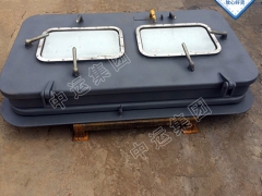 船舱门,包括门板与门框组成,门框与门之间设有密封条,其特征是门框的截面为“S”型嵌入门内式,密封条镶入门内,嵌入门内式门框边与密封条相接触。在门上还设有单把手和多于二个嵌在门框上的门闩,通过连杆用单把手控制多个门闩。本实用新型确保门的密闭性,由单把手控制舌形门闩的结构设计,使门的操作方便,缩短了门的启闭时间。zy17